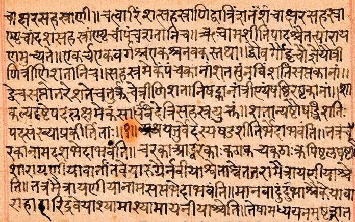 Imagine: fragment dintr-un manuscris din Taittiriya Samhita. Credit: Ms Sarah Welch [CC BY-SA 4.0]