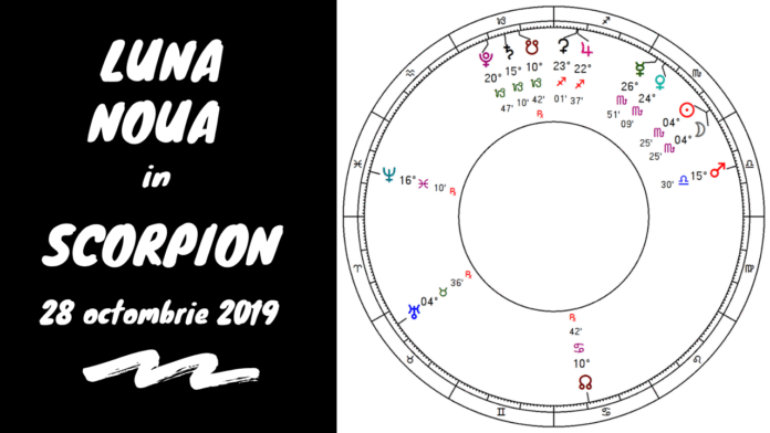 Luna Nouă din 28 octombrie 2019 (ora 5:38 a.m. EET) are loc în Scorpion și este în opoziție partilă cu Uranus din Taur. Axa formată de capetele opoziției cade în punctul median dintre Marte și Venus, guvernatorii celor două zodii, iar semnificația acestei configurații este foarte interesantă și complexă. Pentru întreaga lună lunară care urmează (deci pentru următoarele 29,5 zile), această configurație va reflecta în mod semnificativ sectoarele de viață care corespund axei caselor pe care ea se formează în horoscopul tău.