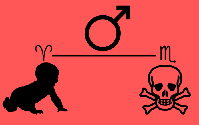 Un fapt important, dar complet trecut cu vederea în literatura astrologică este semnificația faptului că, în ciclul zodiacal, Marte guvernează Berbecul și Scorpionul. Berbecul este un simbol pentru emergența vieții, Scorpionul este semnul morții, așadar avem un Marte care afirmă viața (Marte +) și unul care o neagă (Marte -)